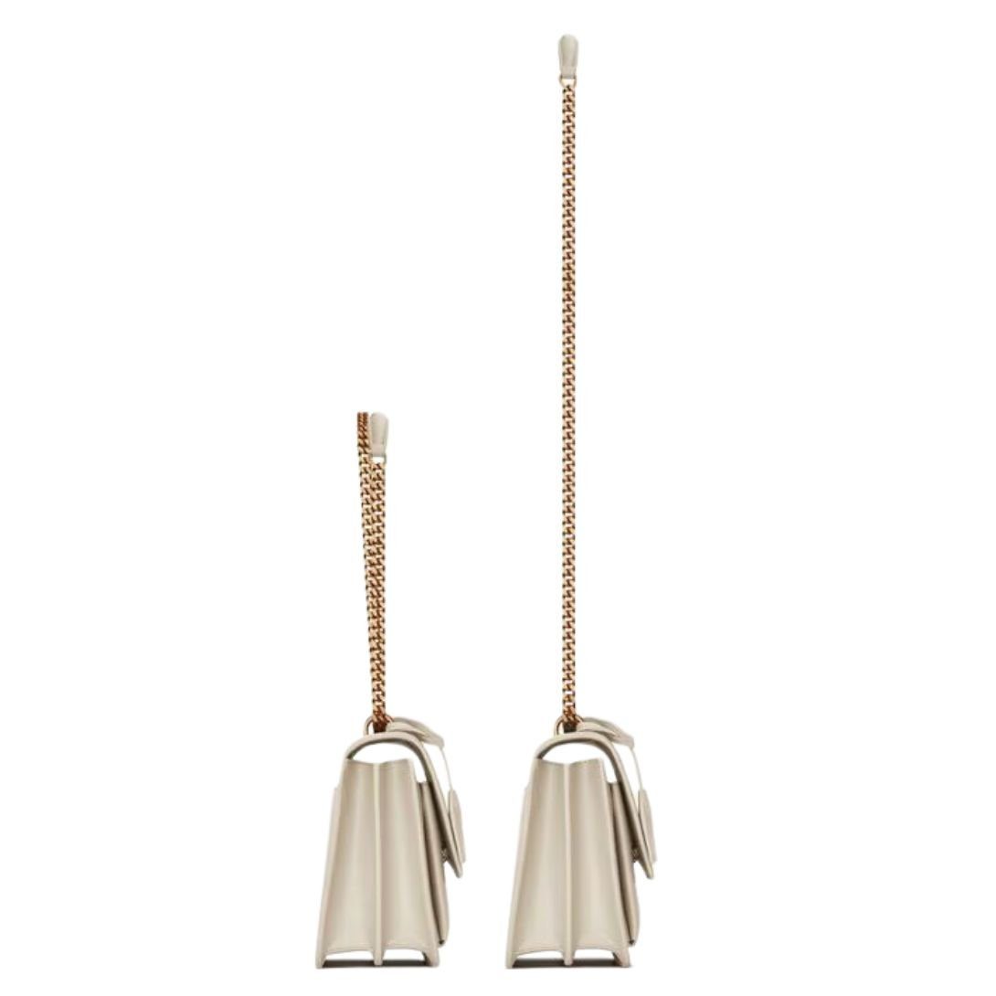 Accordion sides enhance its structured shape, while a sliding chain strap allows for two wearing styles: on the shoulder or crossbody.