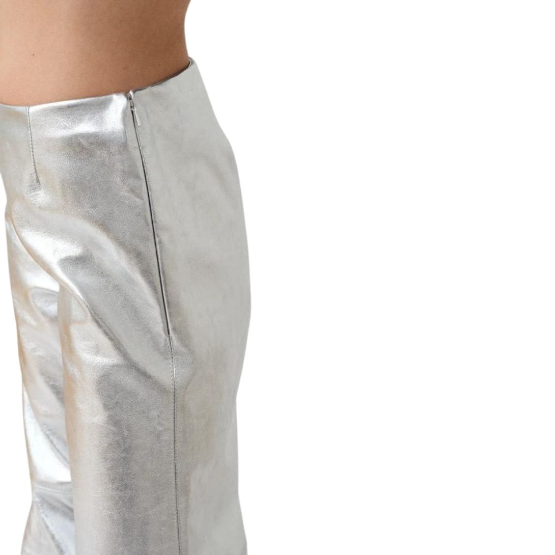 The pants are designed with a slim, tapered fit through the hips and thighs, gradually flaring out from the knee to the hem. This design choice not only elongates the legs but also adds a sense of movement and fluidity to the garment. The shiny, silver fabric is both eye-catching and versatile, allowing the pants to be dressed up with a blouse and heels for a chic evening look or paired with a simple top and sneakers for a more casual, yet still striking, outfit.