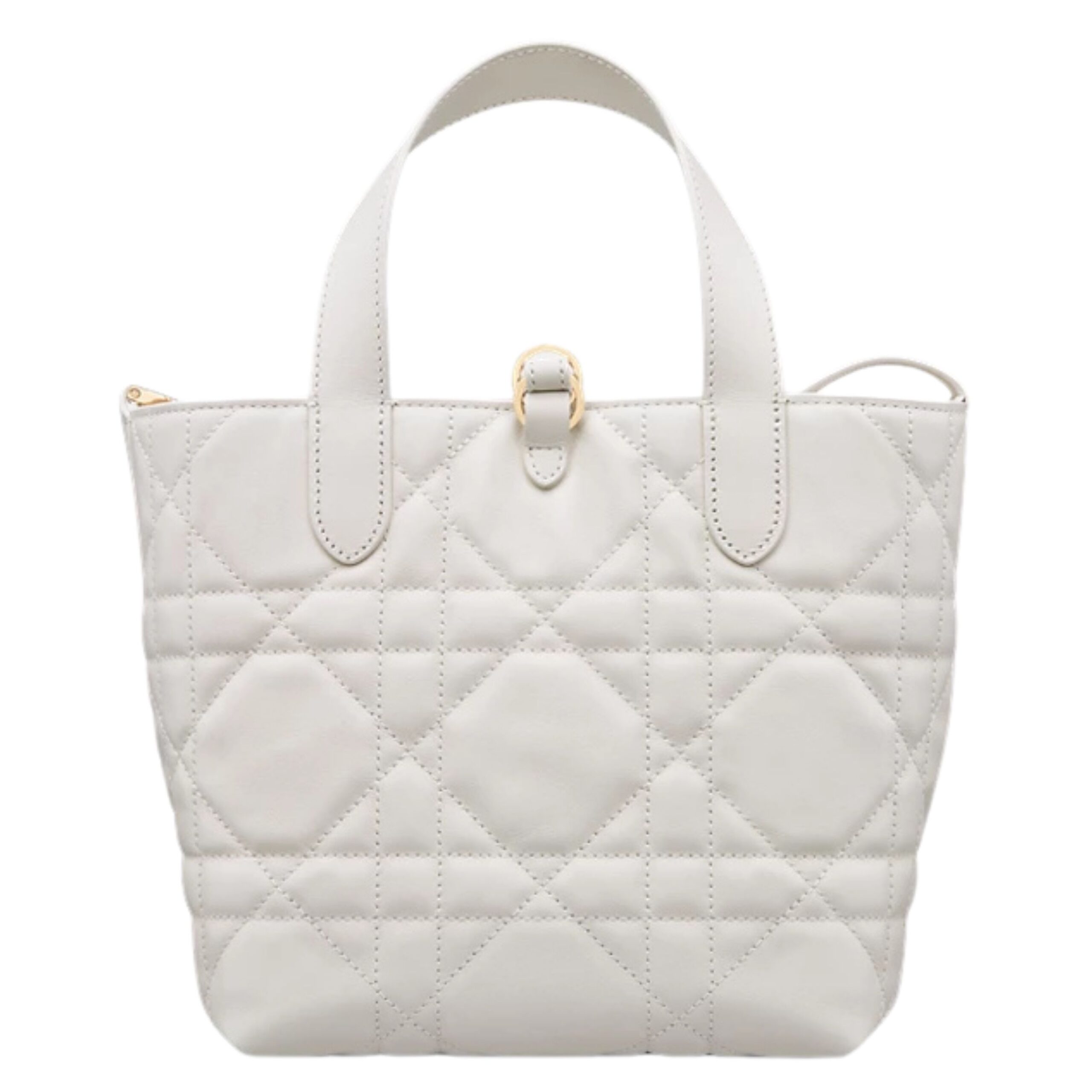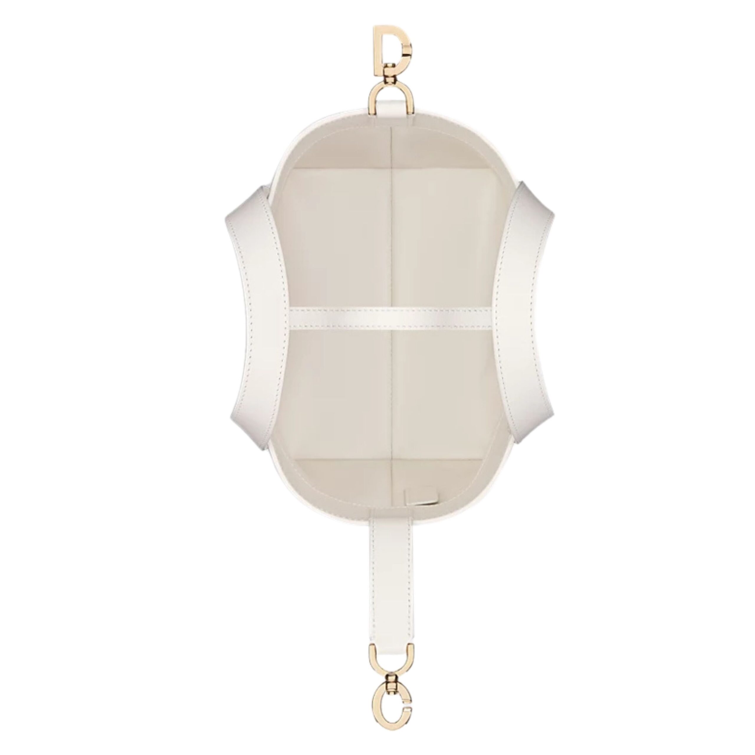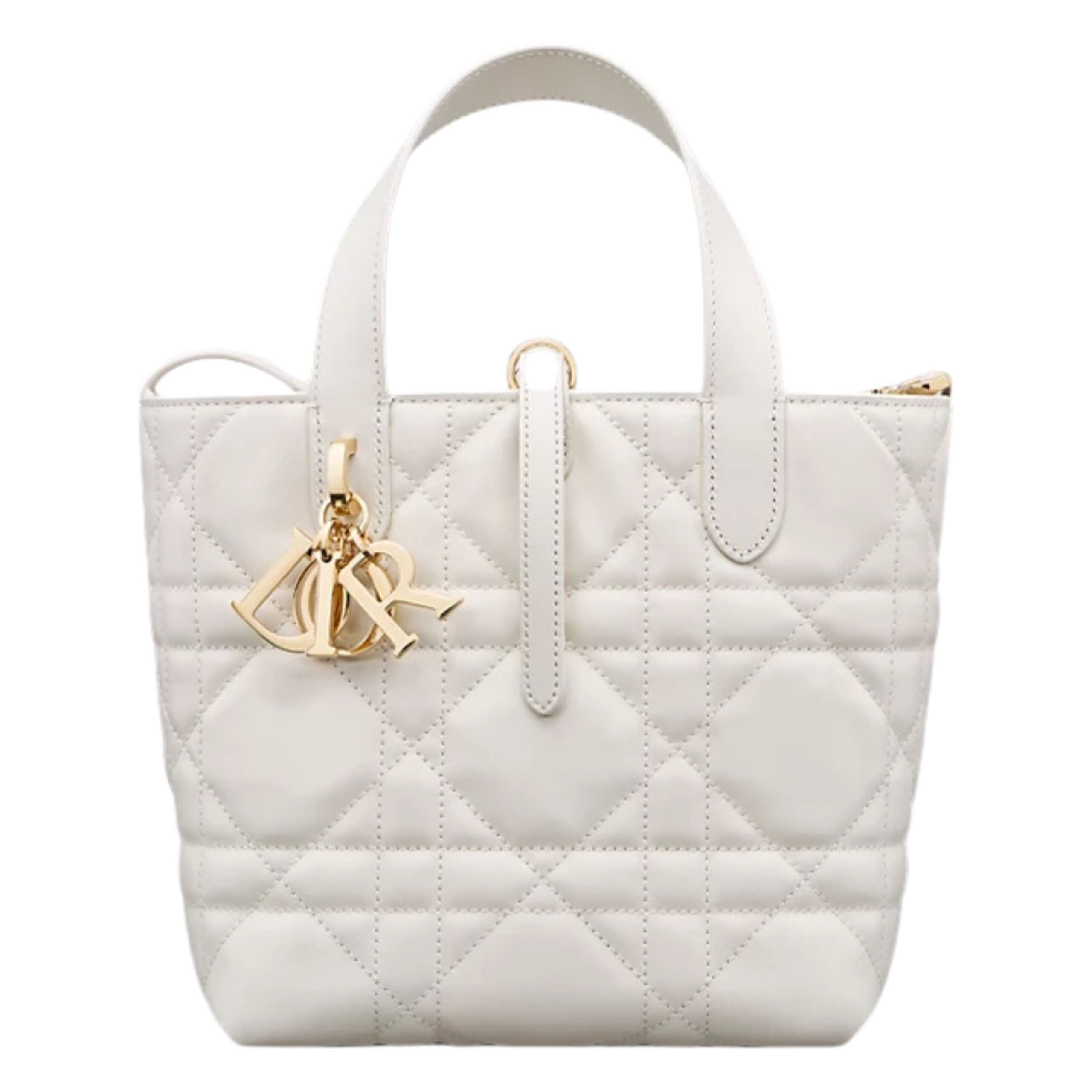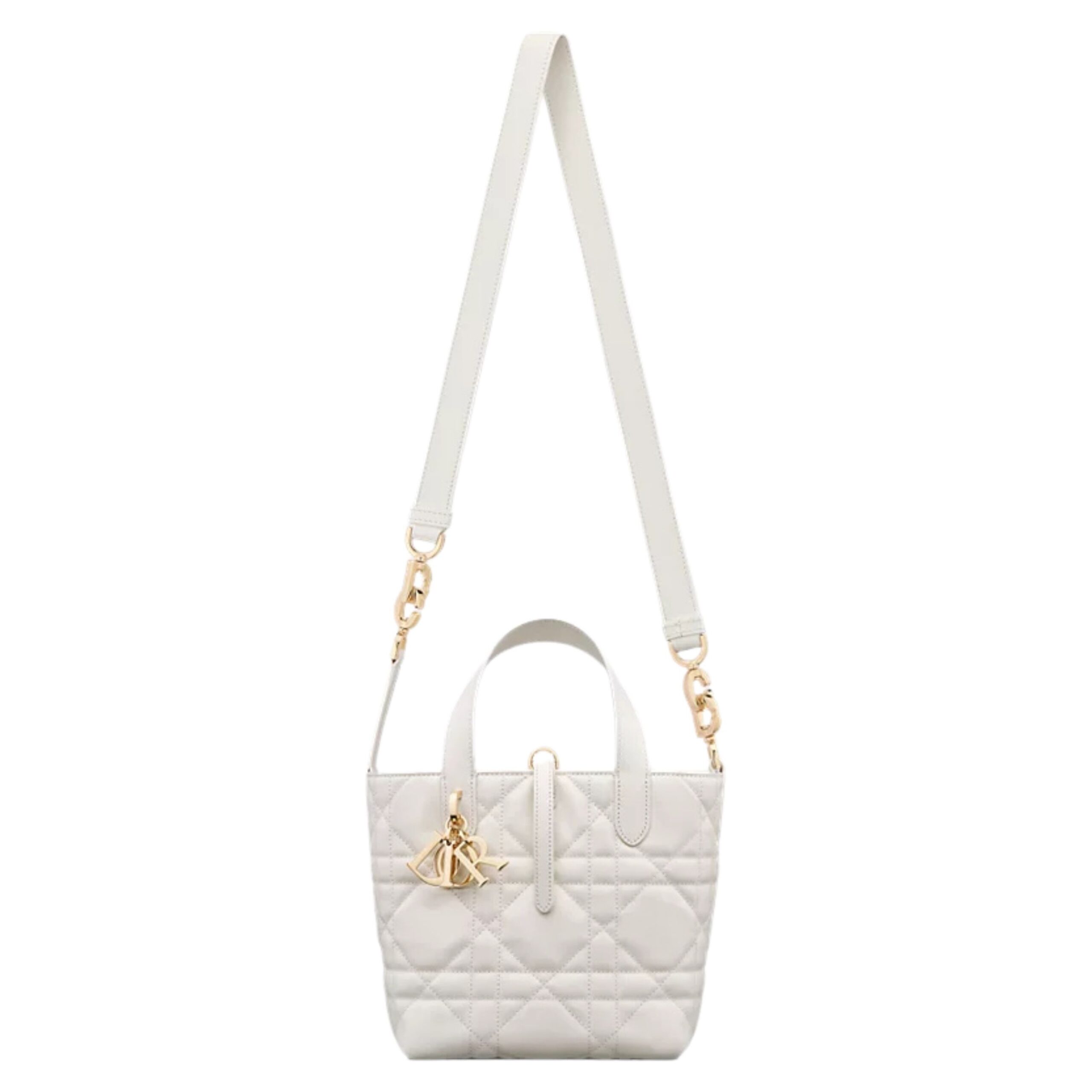 This compact yet spacious bag offers an open-top design with a hidden interior clasp, allowing it to cinch inward for added shape and security. It includes a practical matching removable pouch to keep essentials organized and easily accessible. The hallmark of the design is the antique gold-finish metal “Dior” charms, subtly engraved and dangling from one handle—adding a refined and recognizable finishing touch.