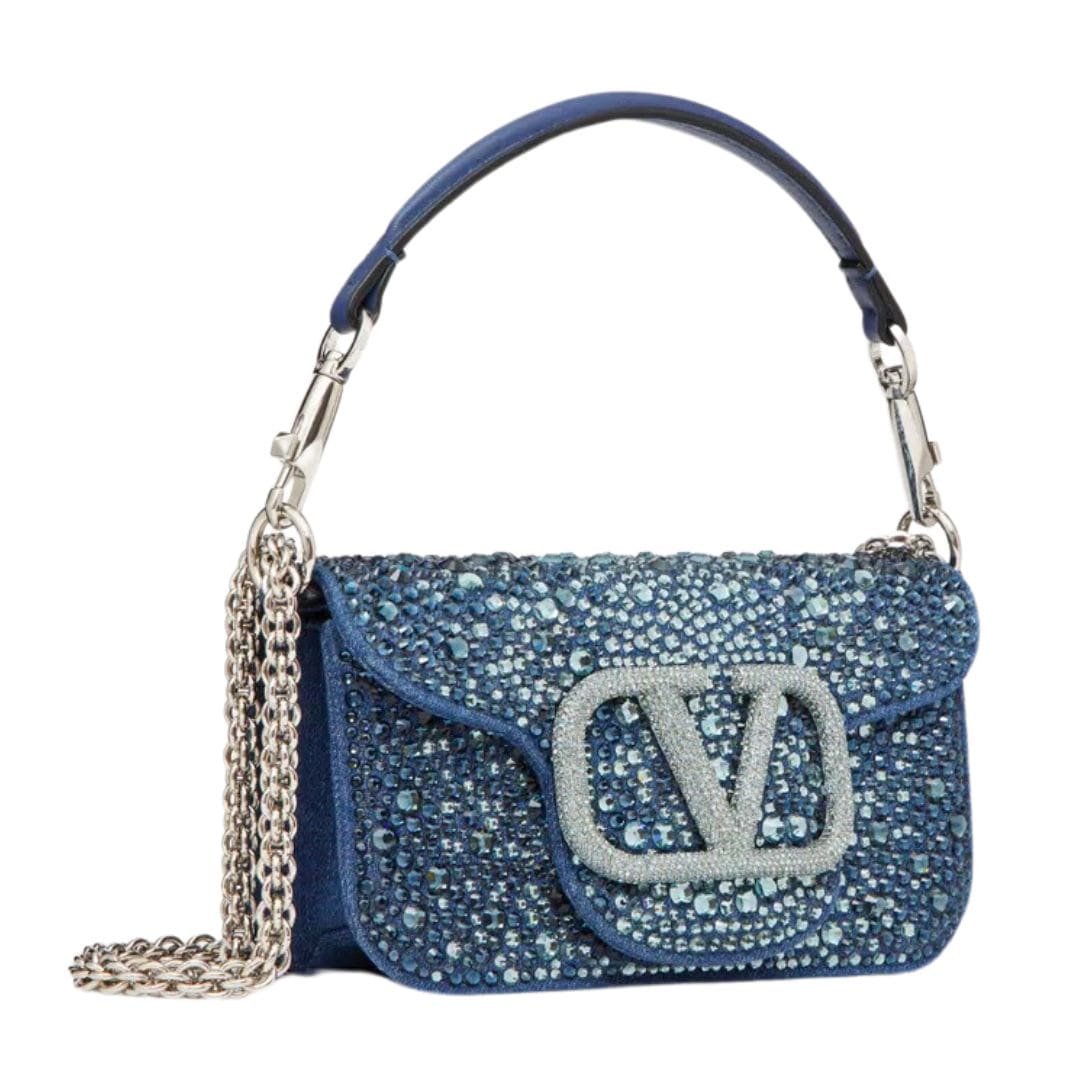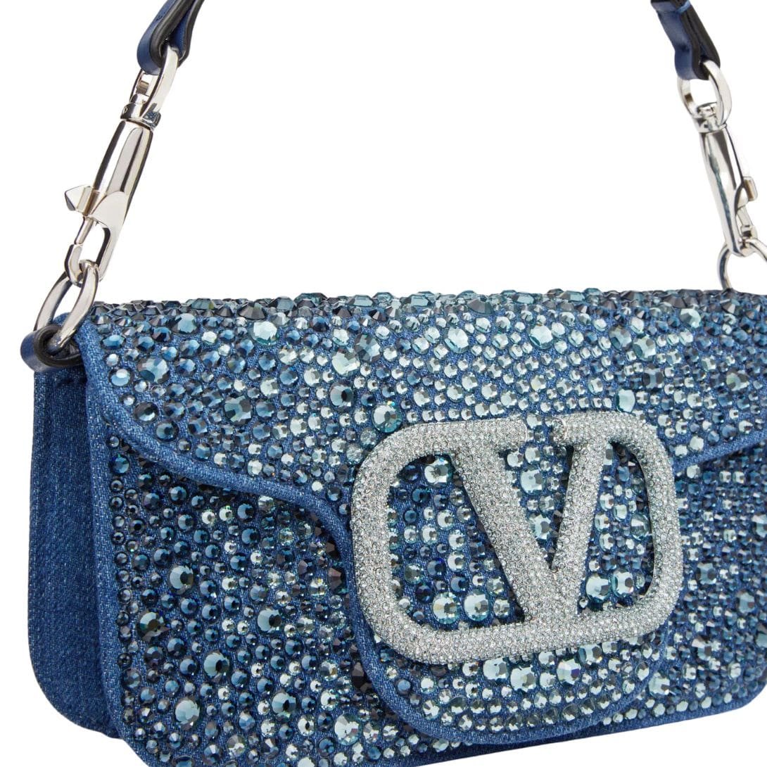 Experience contemporary charm with the Valentino Garavani Locò small shoulder bag, featuring a denim exterior adorned with a gradient-effect rhinestone appliqué and a rhinestone-covered VLogo Signature element, blending style and sophistication seamlessly.