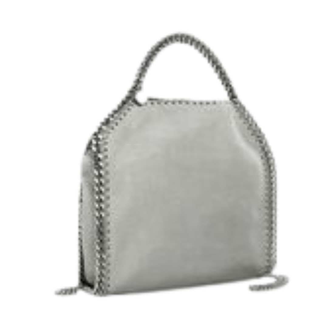 Introducing your everyday style essential: the Stella McCartney Falabella tiny tote bag in steel grey. Crafted in an elegant tiny size, this classic vegan tote is made from matte Shaggy Deer fabric with a semi-gloss grain, offering a slouchy silhouette that effortlessly elevates any ensemble. Framed by our signature Falabella diamond-cut chain hand-laced with waxed GOTS-certified organic cotton, this bag comfortably accommodates all phones, small and medium wallets, alongside daily essentials.