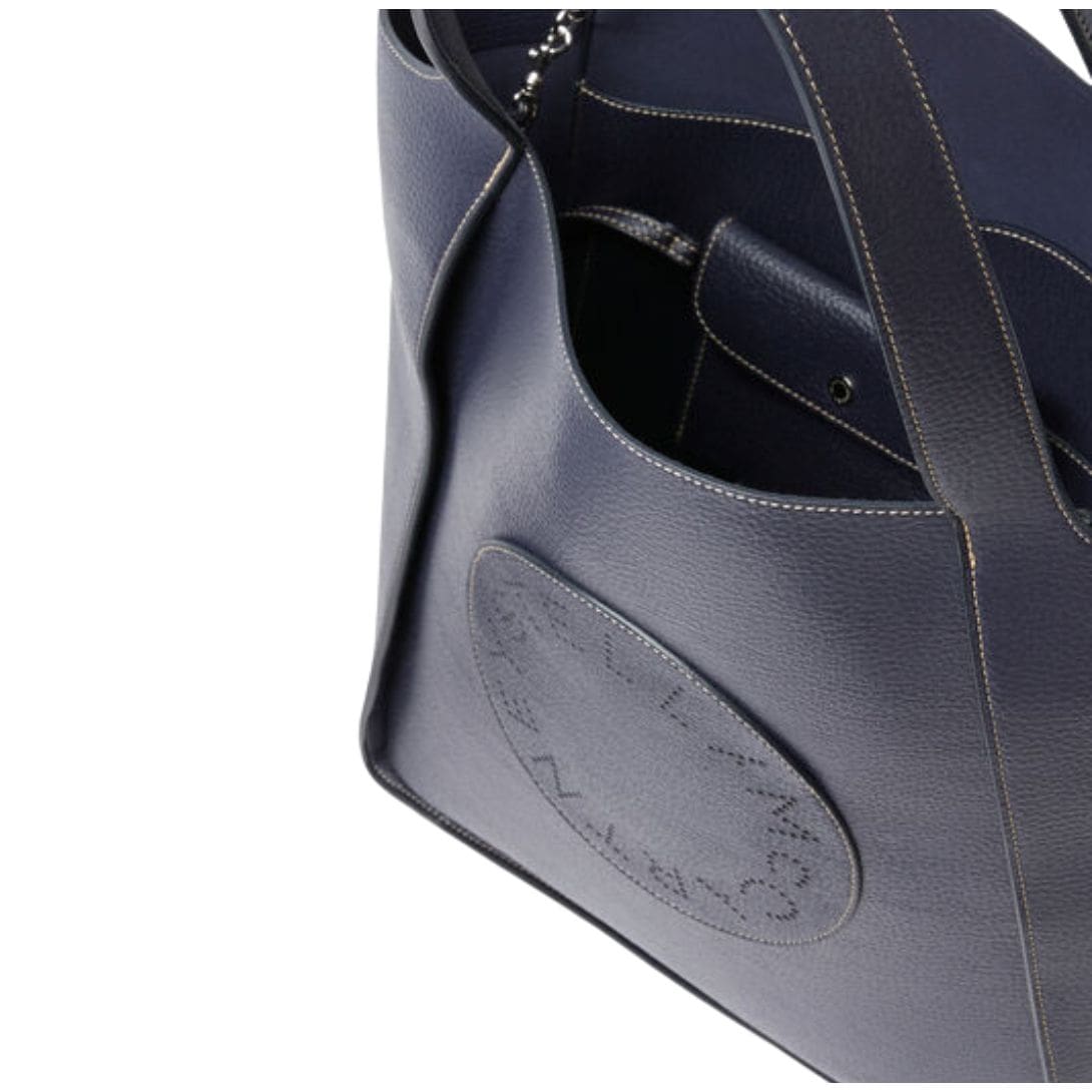 Exemplifying the timeless minimalism of the Stella McCartney Logo square tote bag by Stella McCartney offers versatile appeal for any occasion. Crafted in inky indigo blue, it is made from Alter Mat, a vegan alternative to leather with an embossed grain, featuring a perforated circular logo on the front. With two top handles for easy carrying, this tote includes stainless steel and recycled brass hardware, along with a detachable inner pouch for effortless organization of essentials.