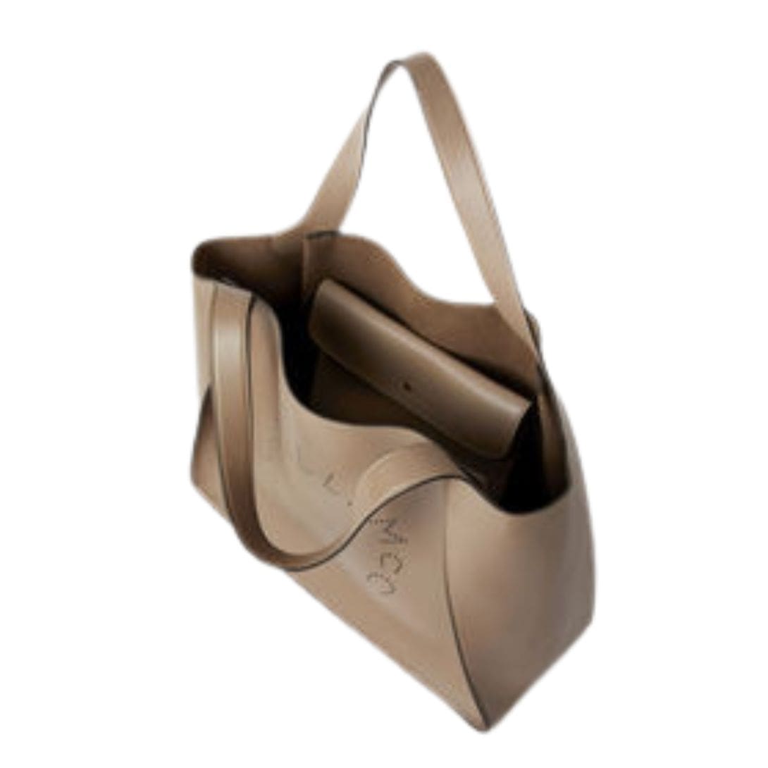 Cherished for its timeless design, our stella mccartney Logo tote bag stands as a foundational staple in the Stella woman’s wardrobe. Reflecting an ageless attitude, this taupe tote bag is consciously crafted from Alter Mat – our luxurious vegan alternative to animal leather – featuring a detachable pouch inside and a perforated logo on the front.