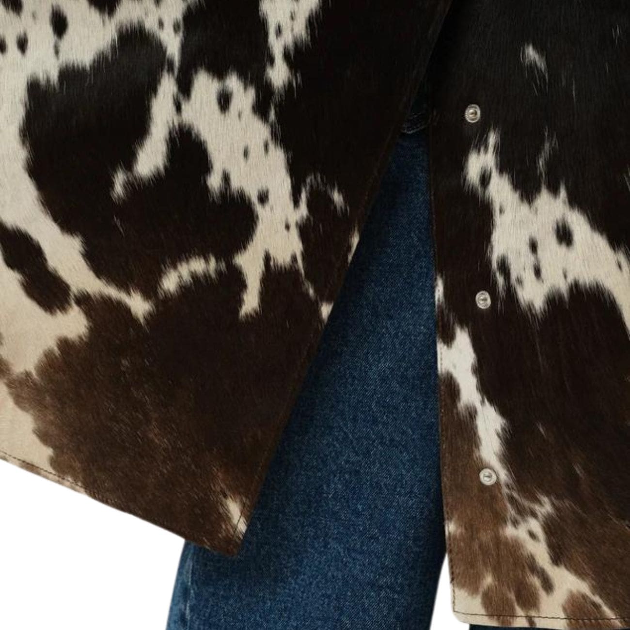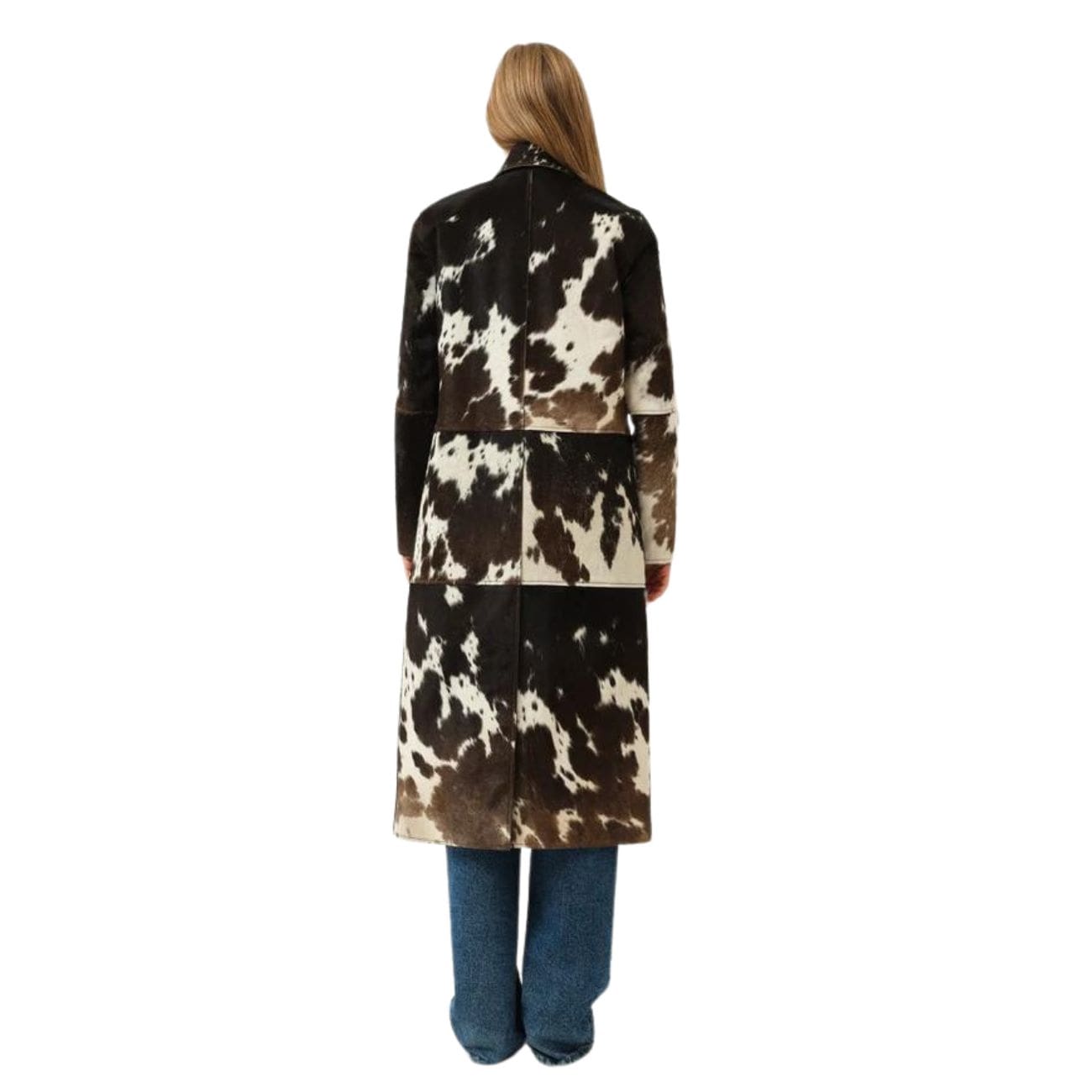 Crafted with sustainably sourced, cruelty-free materials, the coat showcases a soft, durable fabric that provides both comfort and structure. The eye-catching brown and white cow-print pattern adds a playful yet sophisticated element, making it a versatile statement piece for a variety of outfits. The oversized silhouette and relaxed fit enhance its contemporary aesthetic, offering ease of movement and layering options for colder days.