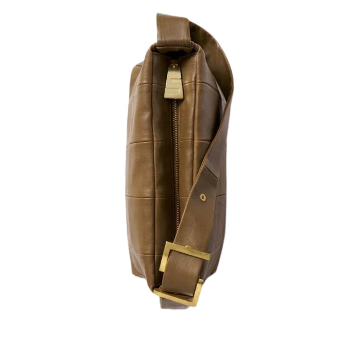 The Stouls Elina leather Bag offers versatility and style, designed to be carried on the shoulder or across the body with an adjustable handle for a customized fit. It features a secure zipper closure and is crafted from a blend of 100% lamb leather, 97% cotton, 2.4% lyocell, and 0.6% elastane. The interior, lined with 100% recycled polyester, includes one zipped pocket, one bellows pocket, and one patch pocket for organized storage. Measuring L 35 x H 21 x D 14 cm, the bag’s buckle and eyelets are made of polished brass, which will develop a natural patina over time.