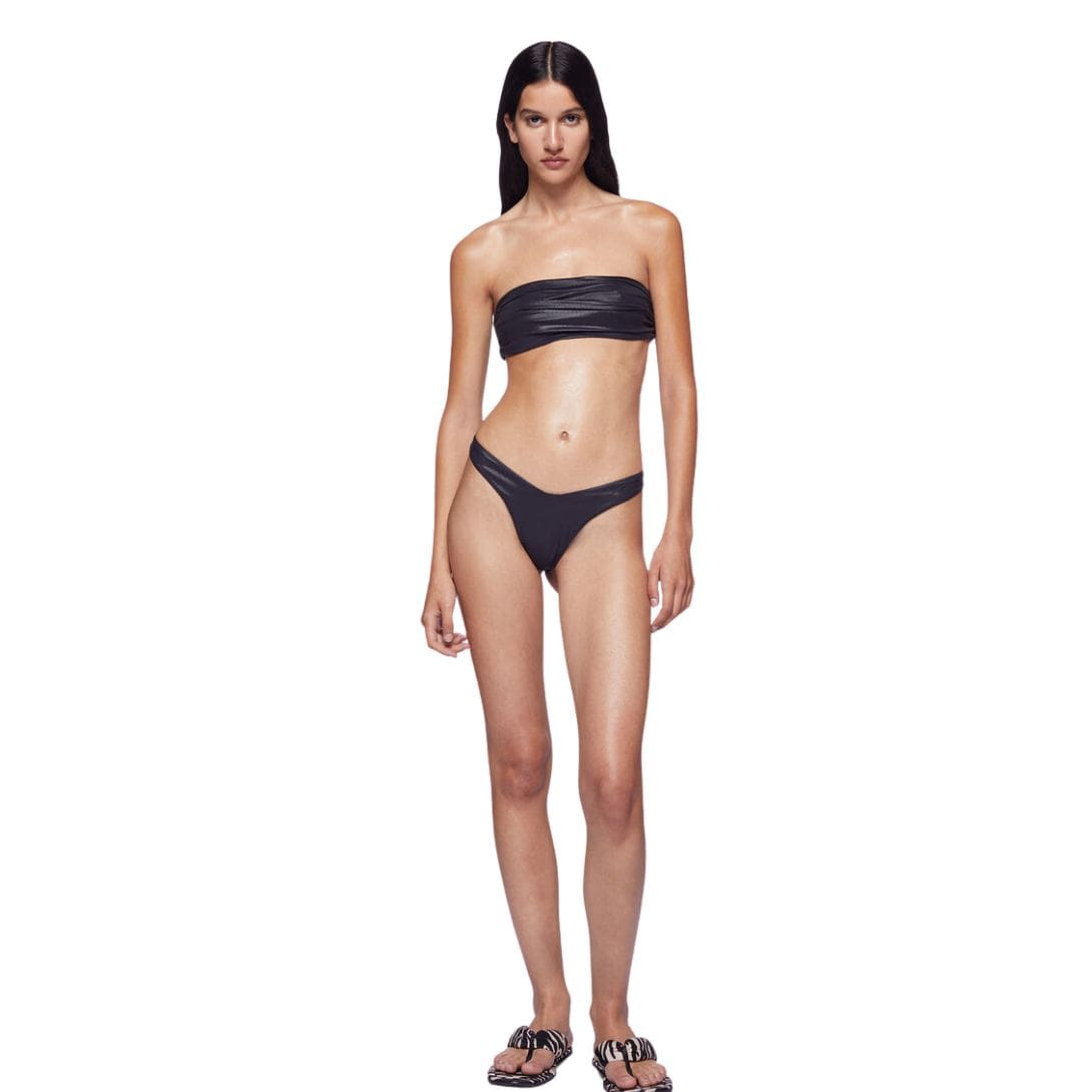 This Italian-made The Attico Black Bikini is crafted from black wet effect lycra, featuring a draped bandeau bra and a printed logo.