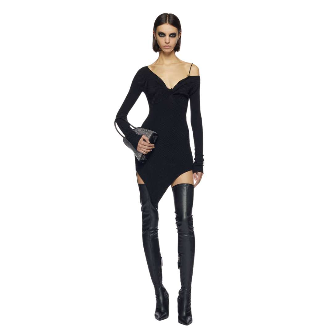 The Attico ”Desai” Black Mini Dress in black stretch viscose knit with long sleeves, asymmetrical neckline and bottom, and a logo metal ring. Made in Italy.