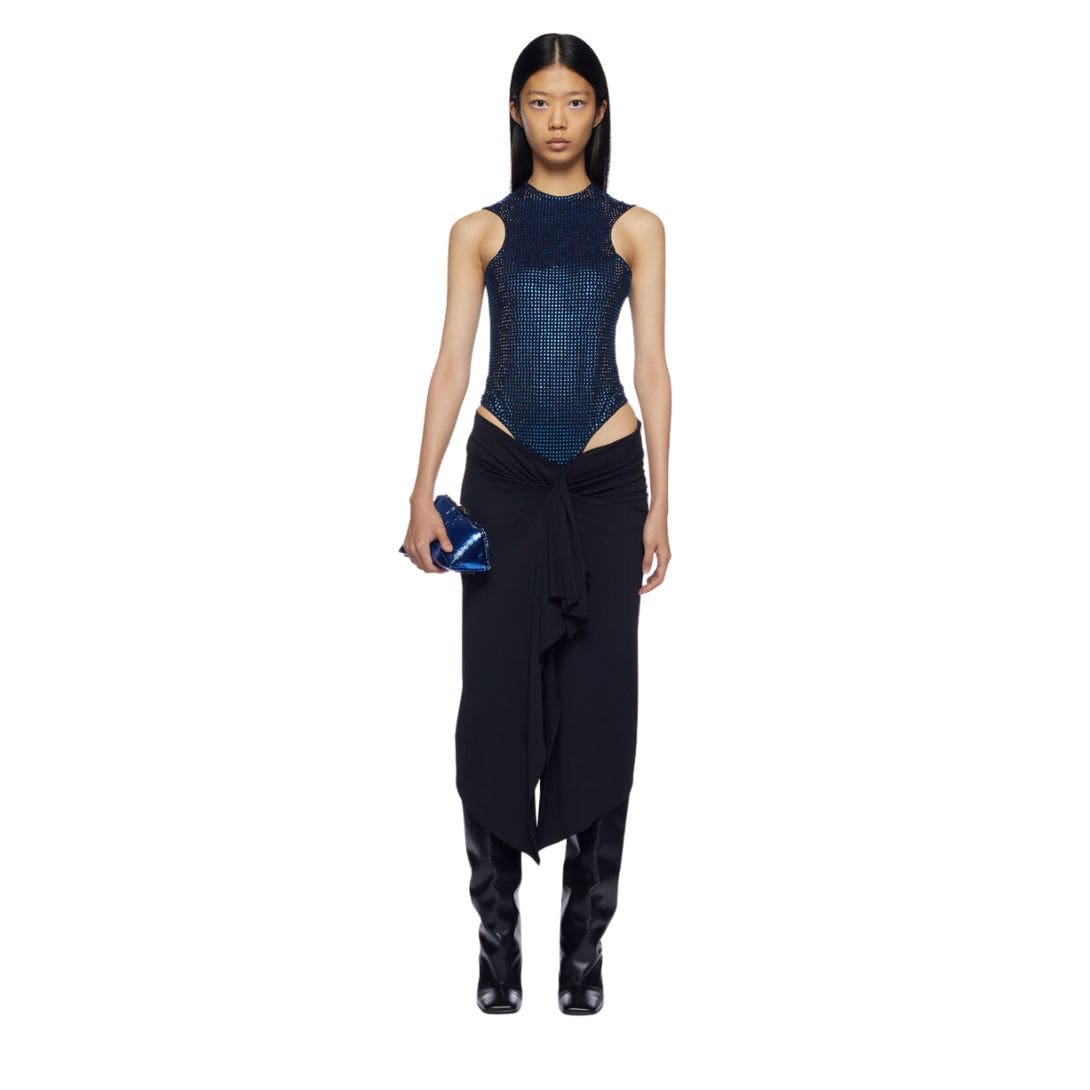 The Attico ”Mirna” Blue and Black Midi Dress in black compact techno jersey with blue thermostrass, featuring a halter neckline body, handkerchief skirt, and logo metal hook. Made in Italy.