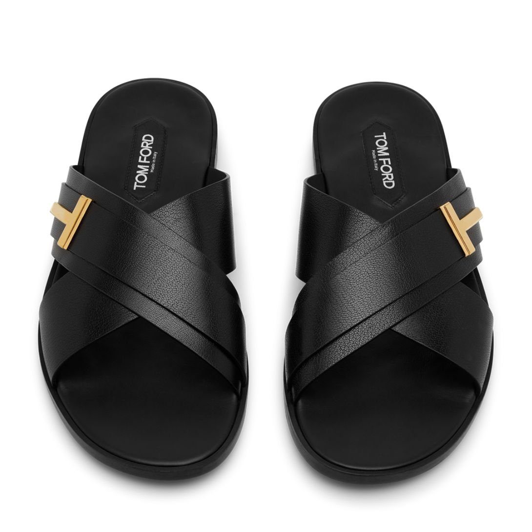 The Preston Tom Ford Grain Leather Preston Sandal features a stylish and contemporary design with T hardware applied to the upper, showcasing beveled edges for a sleek and refined look. The black leather piping along the crossband adds a touch of contrast and sophistication, elevating the overall appearance of the sandal.