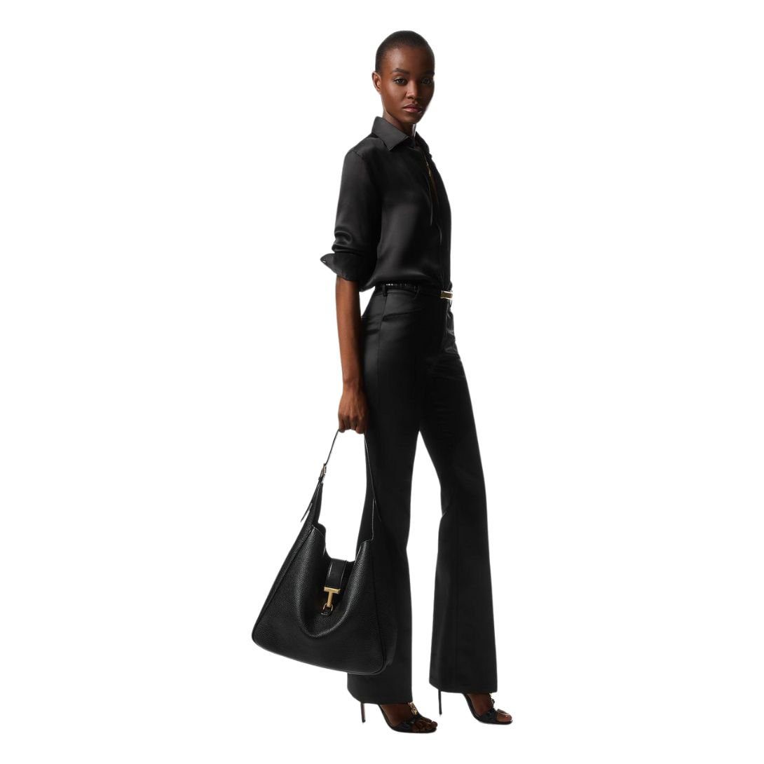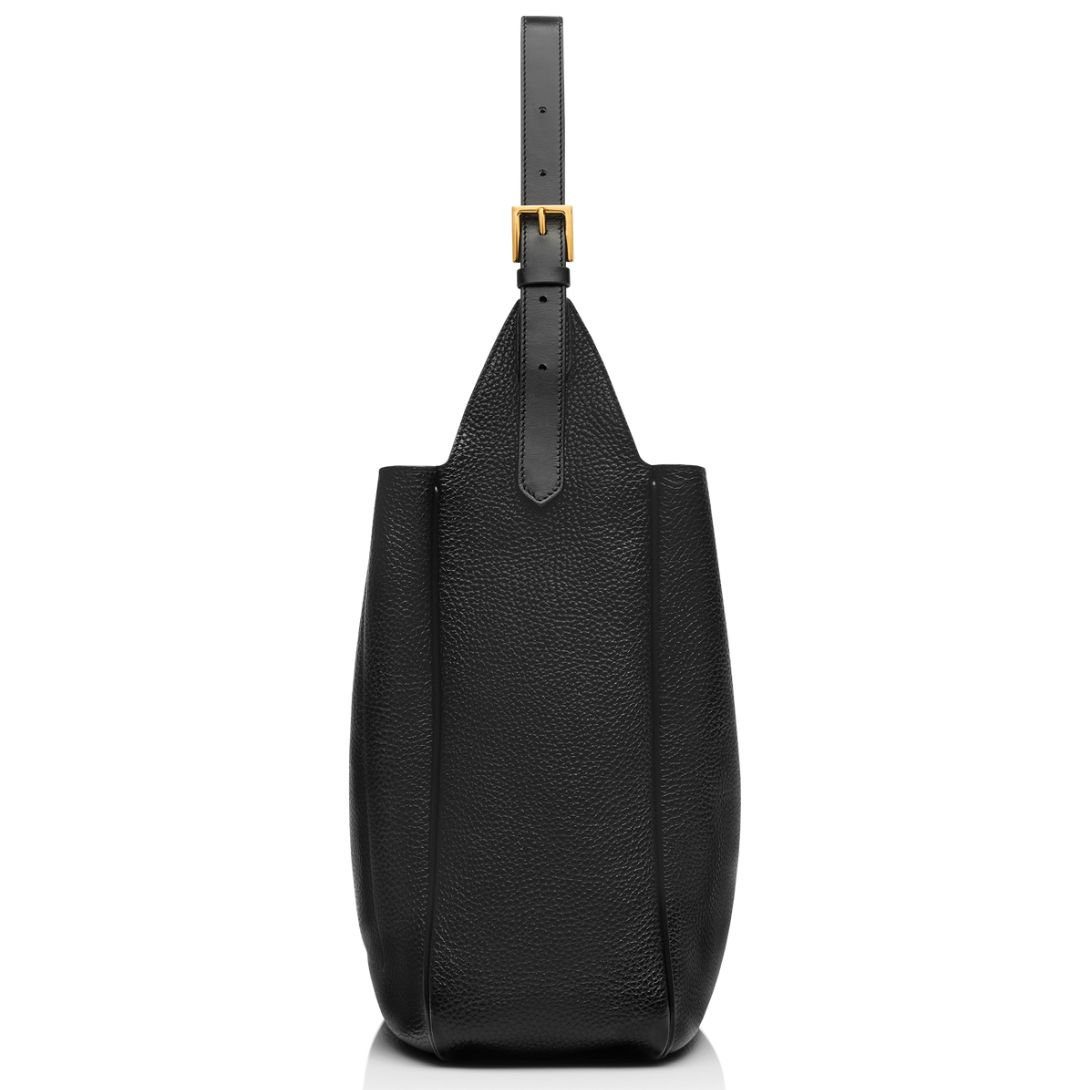 This sophisticated Tom Ford Leather Monarch Large Hobo Black features a T pin clasp detail with an engraved Tom Ford logo, adding a distinctive and luxurious touch. The sleek design combines both function and style, perfect for any occasion.