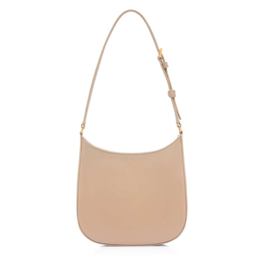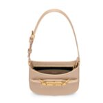 The Tom Ford Palmellato Effect Leather Mini Bag Light Beige features a front panel decorated with a metal T-shaped signature, adding a distinctive touch of luxury. This signature detail enhances the overall elegance of the piece.