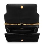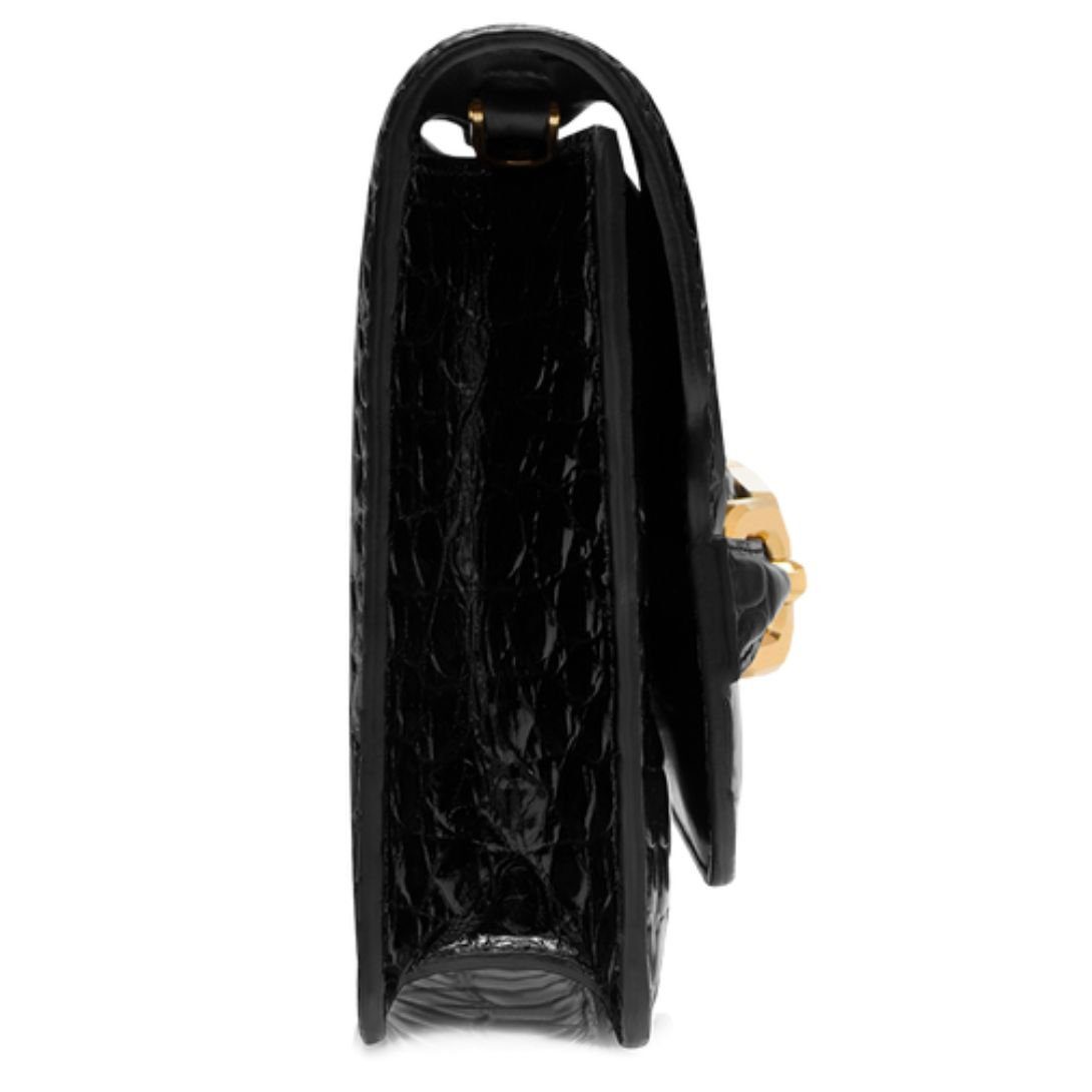 The Tom Ford Stamped Crocodile Leather Small Shoulder Bag Black is adorned with a metal T-shaped signature on the front flap, giving it a bold, distinctive look.