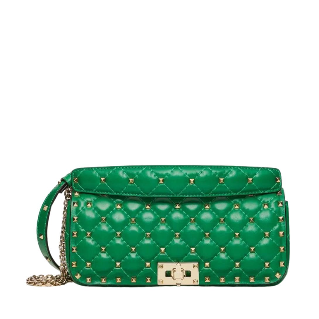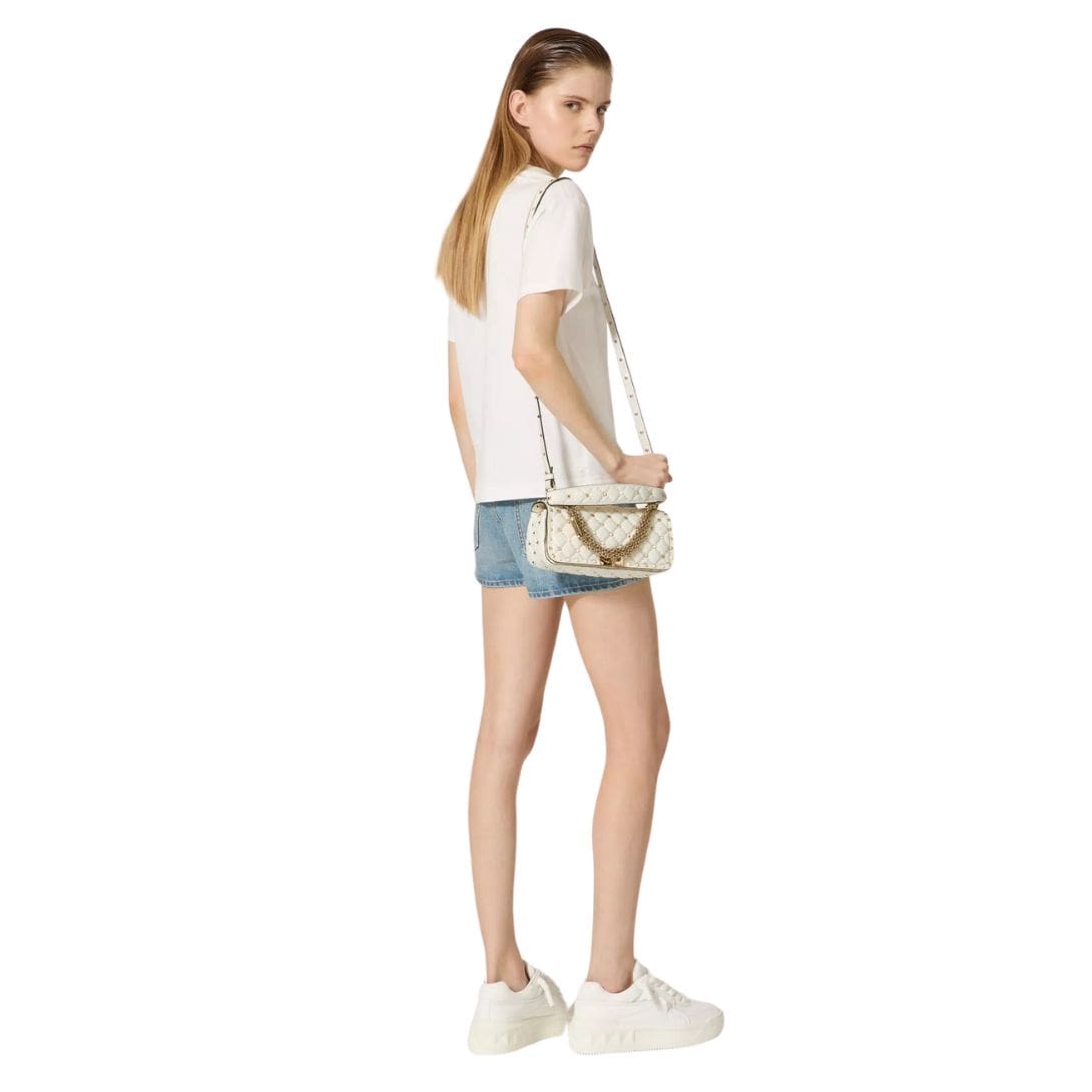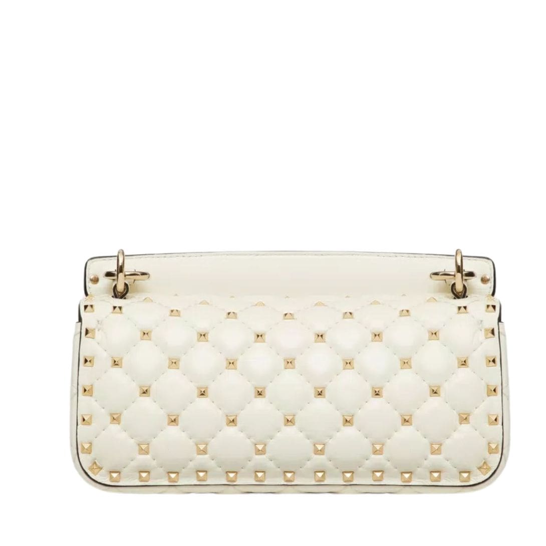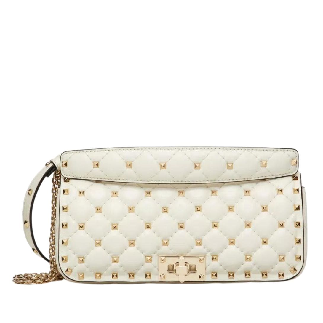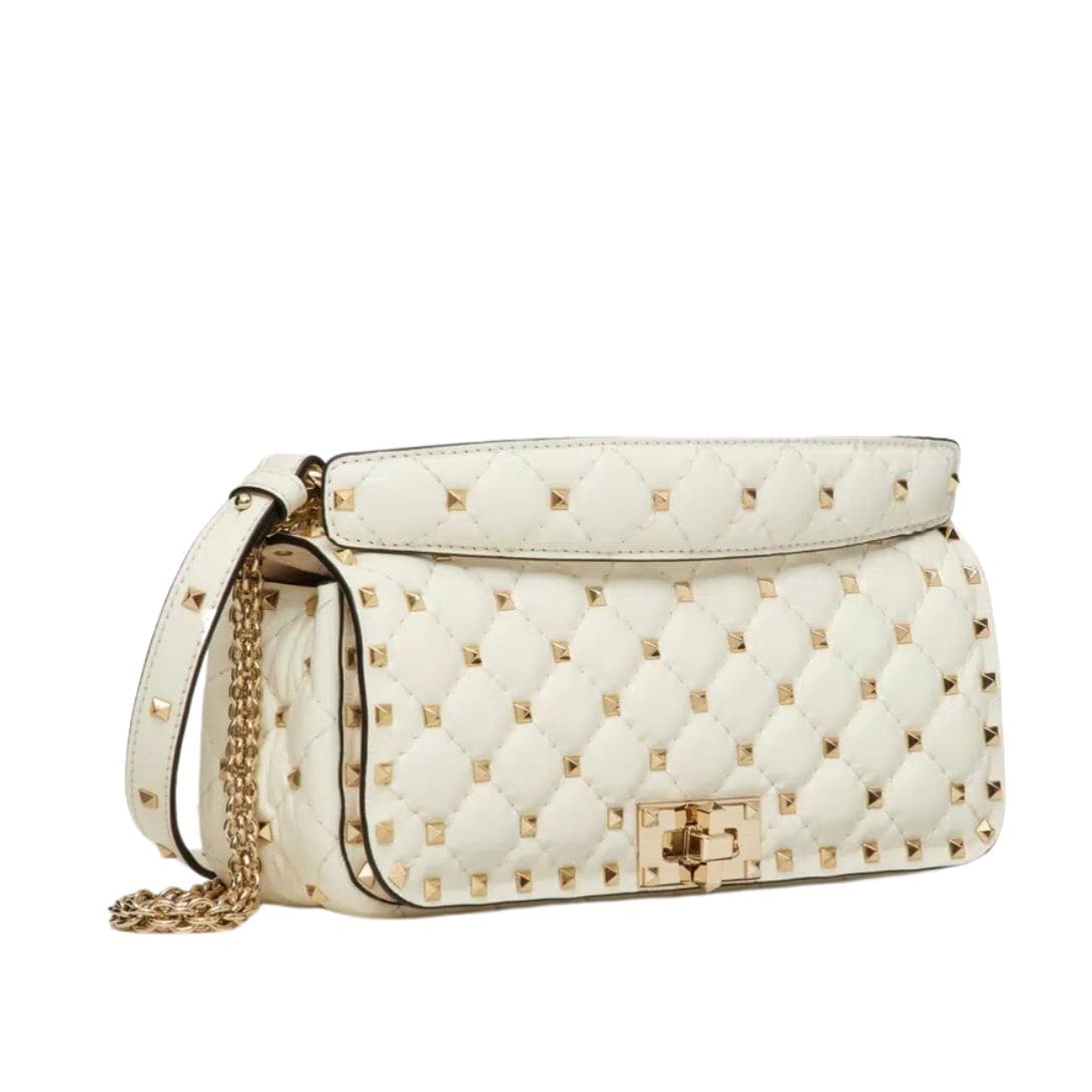 Introducing the Valentino Garavani Rockstud Spike calfskin shoulder bag with chain, crafted from luxurious calfskin leather with a quilted construction adorned with small studs. This versatile bag features both a removable leather shoulder strap and a handle/chain, offering the option to wear it crossbody or handheld.