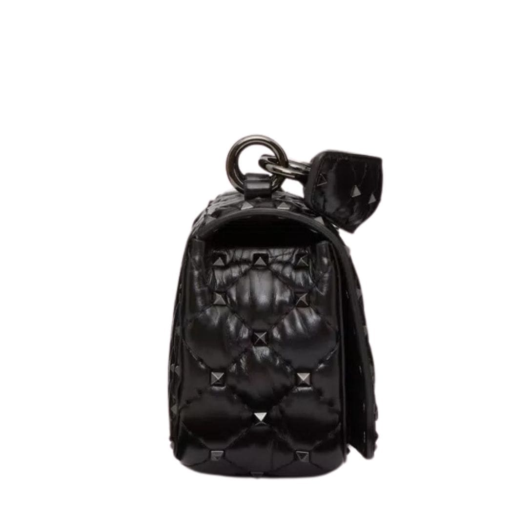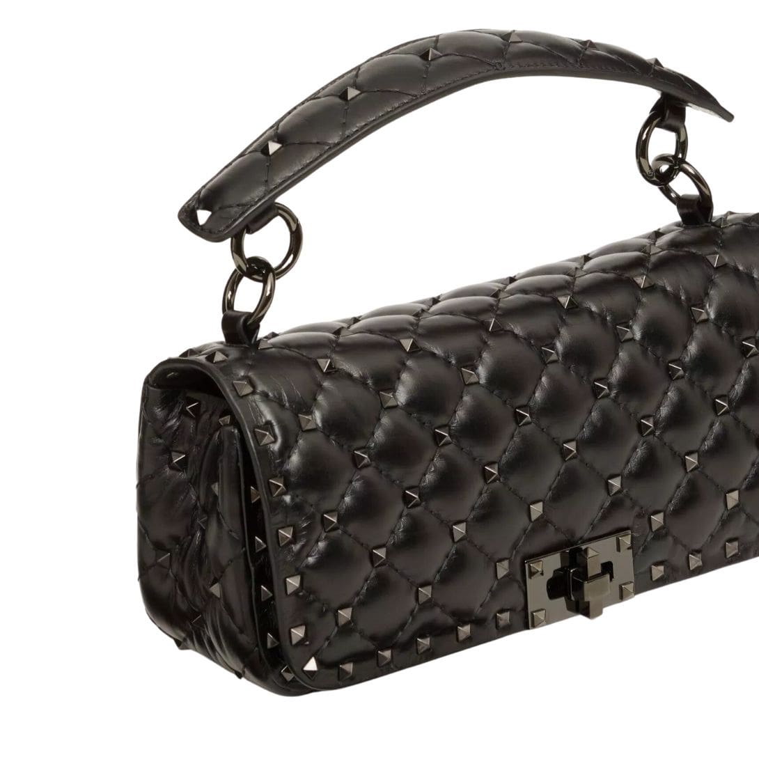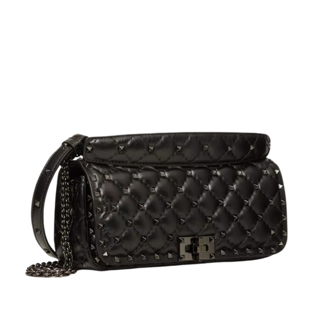 Introducing the Valentino Garavani Rockstud Spike calfskin shoulder bag with chain, crafted from luxurious calfskin leather with a quilted construction adorned with small studs. This versatile bag features both a removable leather shoulder strap and a handle/chain, offering the option to wear it crossbody or handheld.