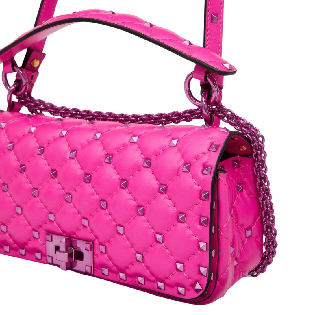 Introducing the Valentino Garavani Rockstud Spike calfskin shoulder bag with chain, crafted from luxurious calfskin leather with a quilted construction adorned with small studs. This versatile bag features both a removable leather shoulder strap and a handle/chain, offering the option to wear it crossbody or handheld.