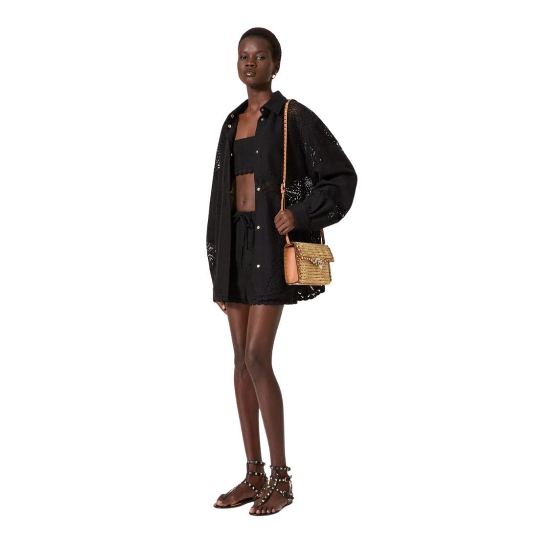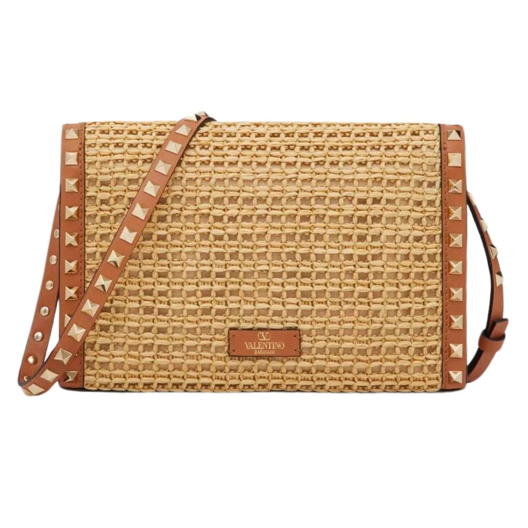 Introducing the Valentino Garavani small Rockstud Shoulder Bag in woven raffia, meticulously crafted in woven synthetic raffia for a touch of summer elegance.
