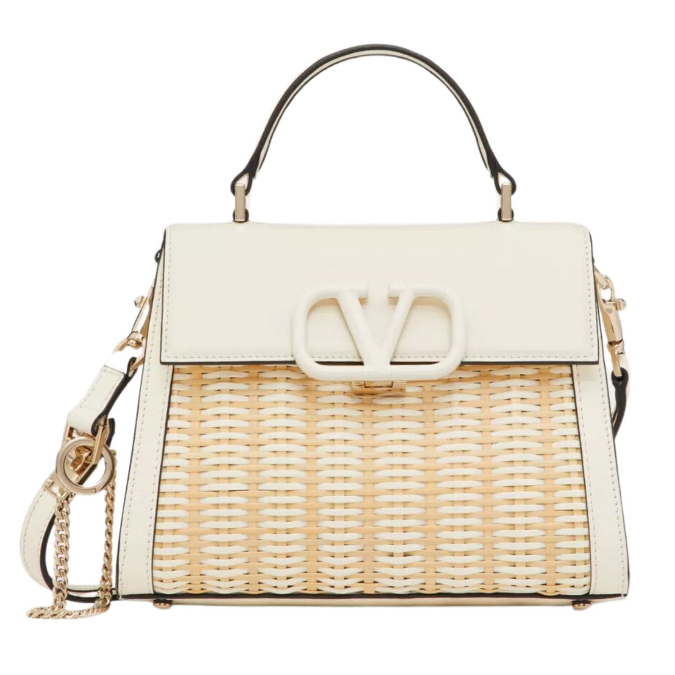 Introducing the Valentino Garavani Small vsling wicker Handbag, meticulously crafted in woven wicker and adorned with a leather-covered VLogo Signature closure. This exquisite accessory offers versatile wearing options, allowing it to be worn crossbody/over the shoulder using the extendable shoulder strap, or carried elegantly by the handle.