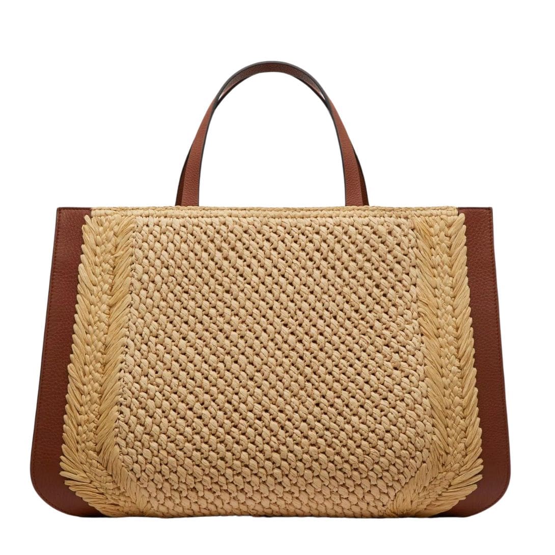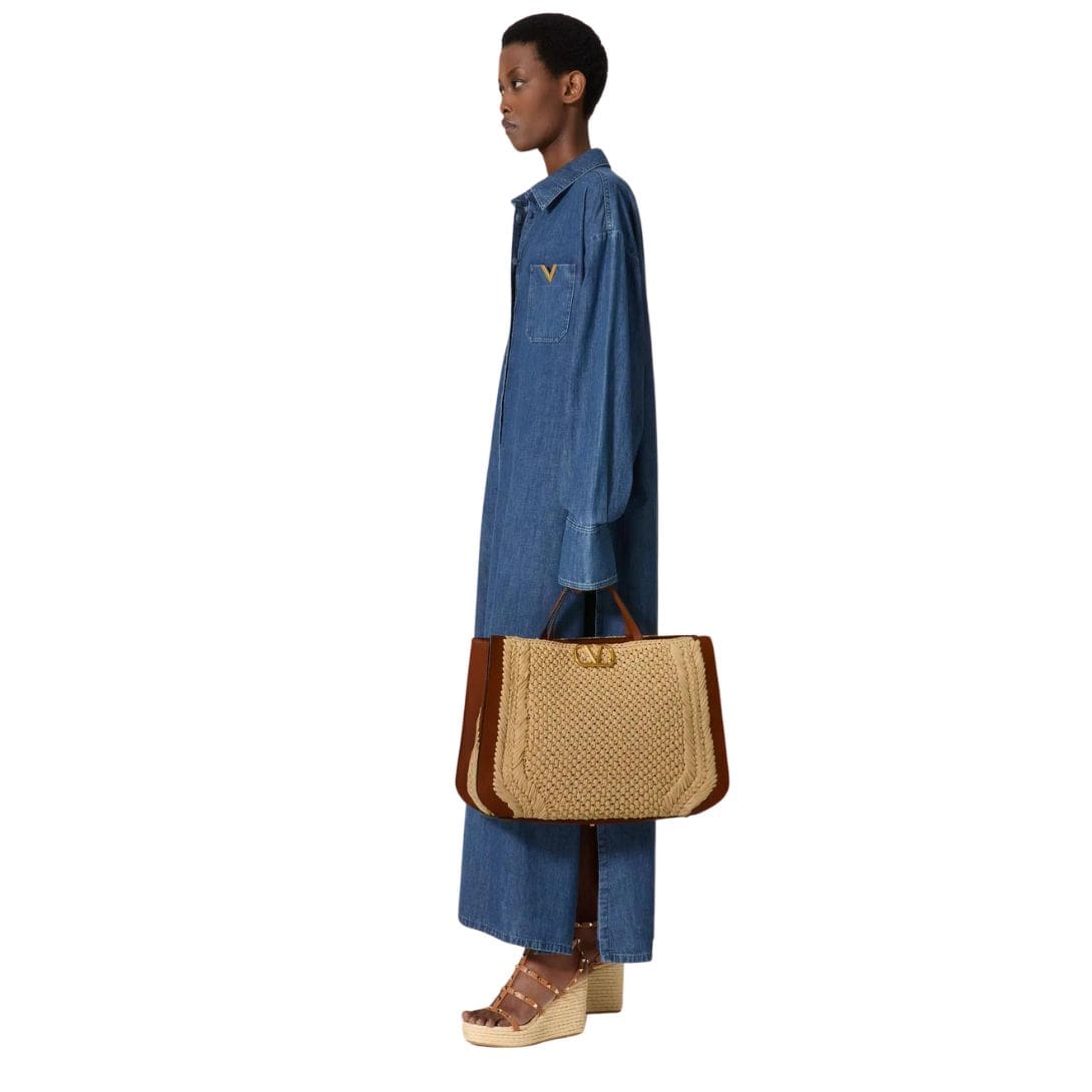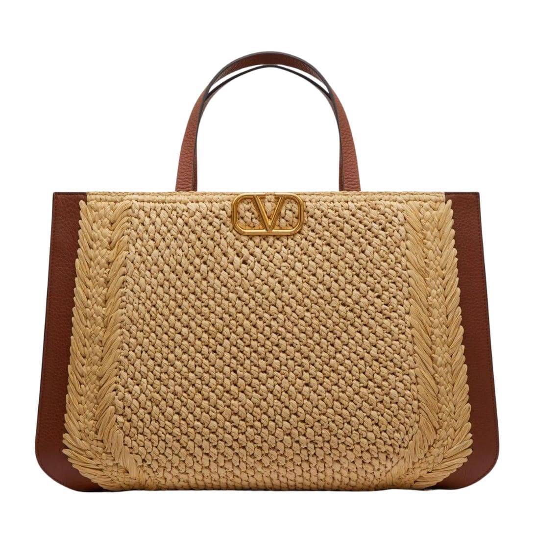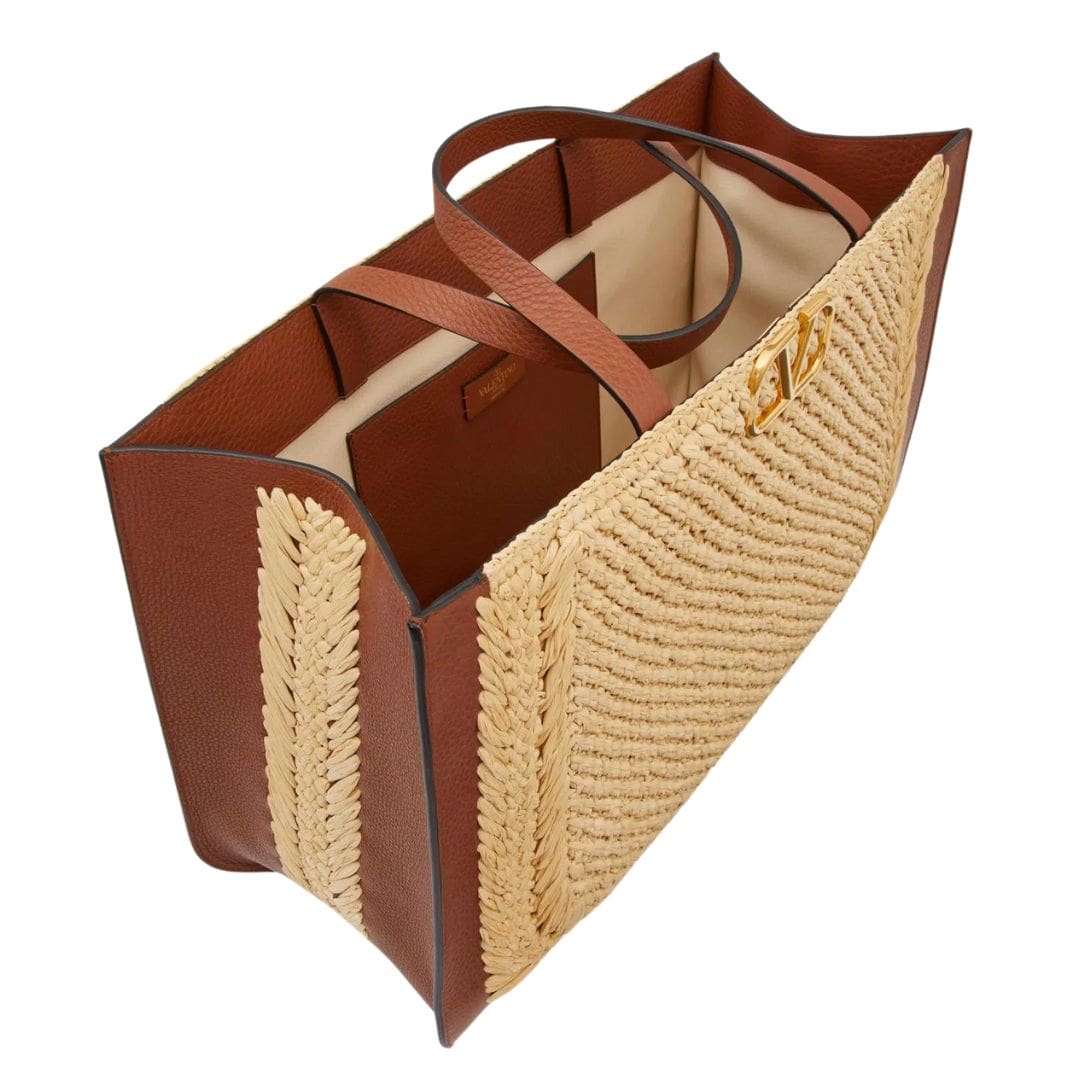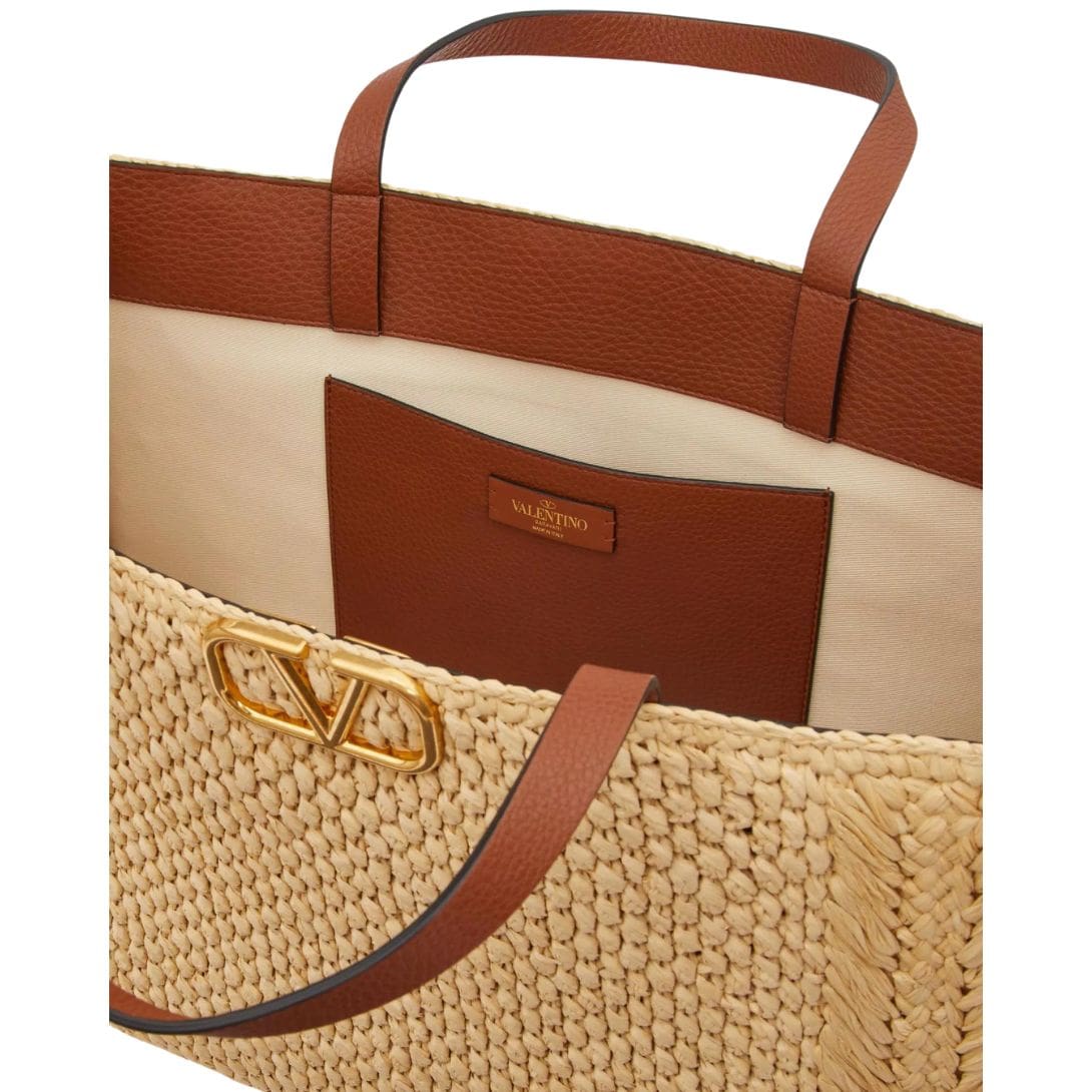 Introducing the Valentino Garavani VLogo Signature raffia handbag, meticulously crafted from synthetic raffia with leather trim, featuring the iconic VLogo Signature element adorning the front.