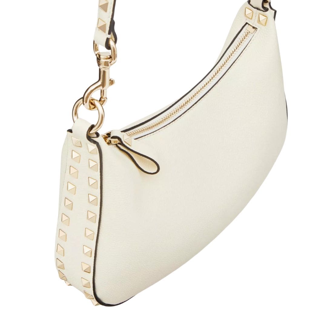 Introducing the Valentino Garavani Rockstud small hobo bag, meticulously crafted from grainy calfskin. Versatile in its design, it offers multiple carrying options: shoulder, crossbody, or handbag, thanks to its removable handle and shoulder strap. Adorned with platinum-finish studs and hardware, this bag exudes a sophisticated allure. The zipper closure ensures security, while the adjustable and removable studded leather shoulder strap adds a touch of edgy elegance. Inside, discover the luxurious leather lining and one slip pocket for convenient organization. With a shoulder strap drop length of 57 cm, this bag offers comfort and style. Dimensions: W25xH20xD4 cm. Made with precision in Italy.