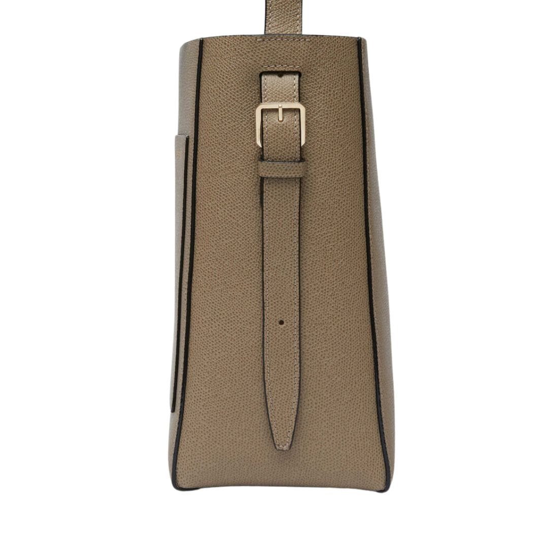 The Valextra soft Bucket Mini bag embodies the same urban flair as its larger counterpart but in a more compact size. This understated shoulder bag features a sturdy structure that maintains its shape effortlessly, while a small removable leather pouch ensures secure storage for belongings. Additionally, its discreet external curved pocket provides convenient access to cards and passes. Finished with our signature hand-painted black lacquered Costa edging, this oyster brown companion exudes distinction, making it an ideal everyday accessory.