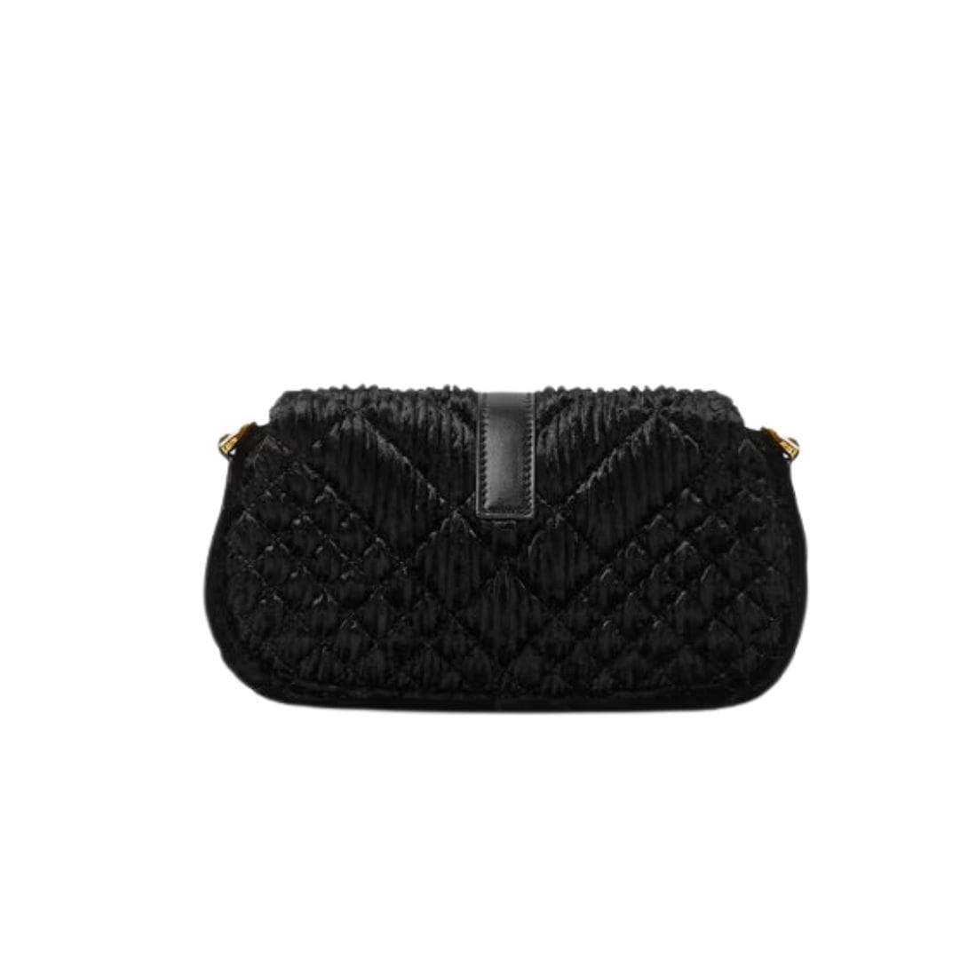 Crafted from sumptuous velvet fabric, the bag exudes a rich texture that invites touch and admiration. The plush material not only adds a sense of luxury but also enhances the bag’s visual appeal, creating a striking contrast against its sleek silhouette.