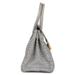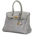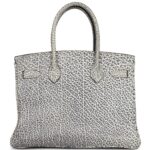 This rare Vintage Birkin is crafted from White Dalmatian Buffalo leather with gold hardware. It features tonal stitching, a front toggle closure, a clochette with a lock and two keys, and double rolled handles, offering a unique and elegant design.