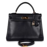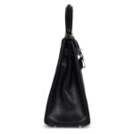 This Hermès Kelly 32 in navy boxcalf leather with gold hardware is a sophisticated and classic piece, featuring a vintage appeal with some gentle signs of wear that add character. It is an ideal accessory for someone seeking a refined, timeless bag that retains both elegance and practicality.