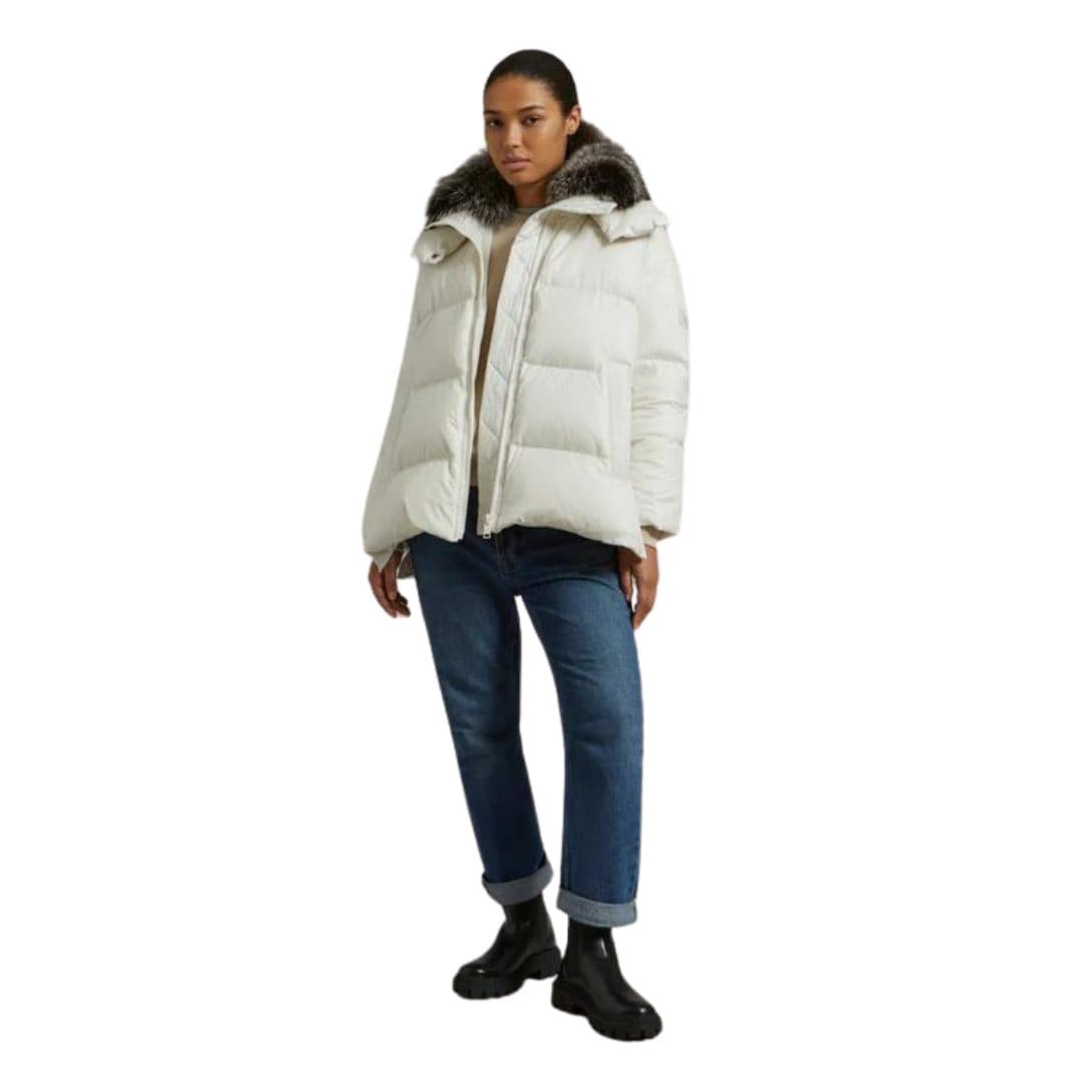 Experience Yves Salomon “A” Line Down Jacket in Water-Repellent Technical Fabric with Fox Fur Collar crafted from water-repellent technical fabric, this “A” line down jacket is padded with high-quality down and duck feathers for warmth and breathability. Design details include a front zip fastening, two welt pockets, and invisible technical ribbed finishes at the bottom sleeves. Functional and lightweight at the same time, this model has side zip slits for extra ease and a touch of modernity. Featuring a detachable hood and a removable collar trim in natural-dyed fox, this versatile down jacket combines comfort with elegance.