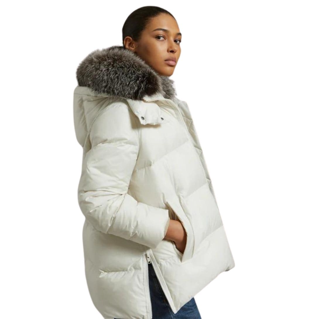 YVES SALOMON “A” LINE DOWN JACKET IN WATER-REPELLENT TECHNICAL FABRIC WITH FOX FUR COLLAR